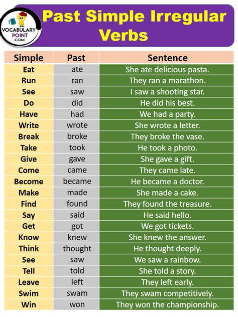 examples of irregular verbs in past simple. There are any references about examples of irregular verbs in past simple in here. you can look below.
