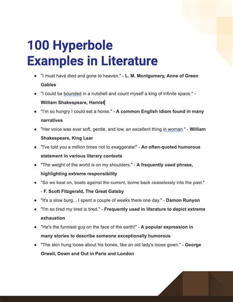 famous examples of hyperbole in literature. There are any references about famous examples of hyperbole in literature in here. you can look below.